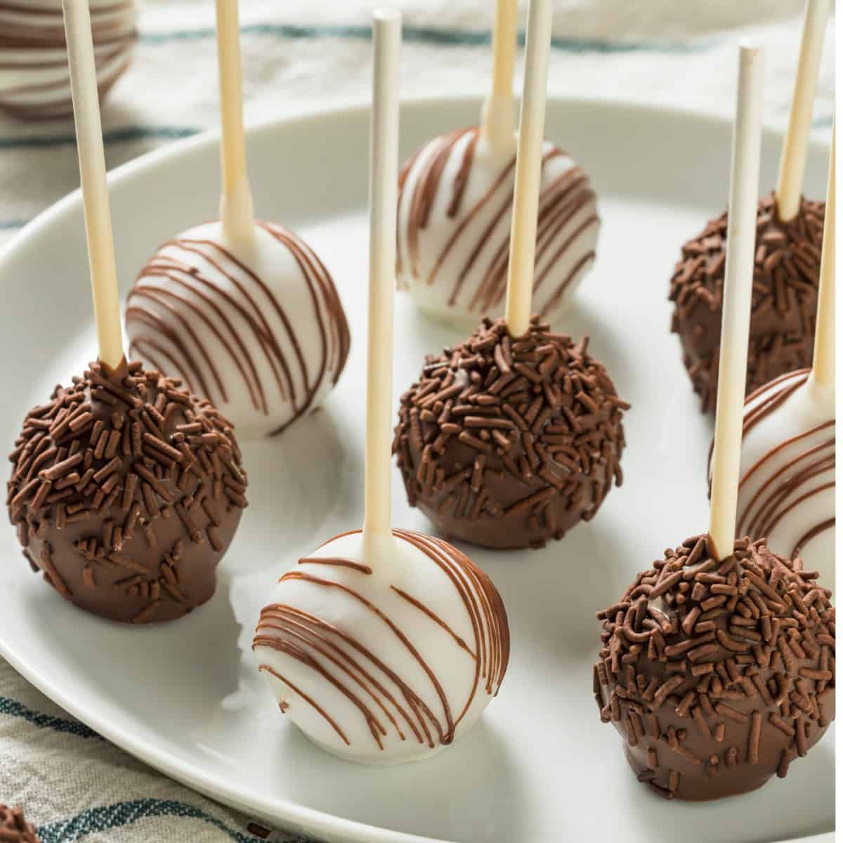 Melt a small portion of your candy melts and dip the tip of each lollipop stick into the melted candy. Insert the coated end of the stick into a cake ball about halfway through. This will secure the sticks in place.